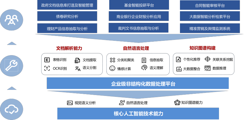冰球突破试玩网页的企业级非结构化处理平台主要处理的是文档、影像件等非结构化数据,通过视觉语义分析和自然语言处理,将结构化数据转化为非结构化数据,后续根据不同业务场景对结构化数据进行关联与分析,协助人们快速的阅读、理解和分析各类文档内容,降低企业、政府及各种组织中文档的重复阅读、整理和分析的工作,提升非结构化数据处理效率及数据的流动、共享和使用能力。产品已经实现了金融行业(银行、、保险)、烟草、政务、财政税务等行业领域的场景落地,完成了良好的工程实现,并积累了大量的金融、政务和烟草行业市场化训练数据,形成了技术壁垒,可以在这些行业进行良好的拓展。